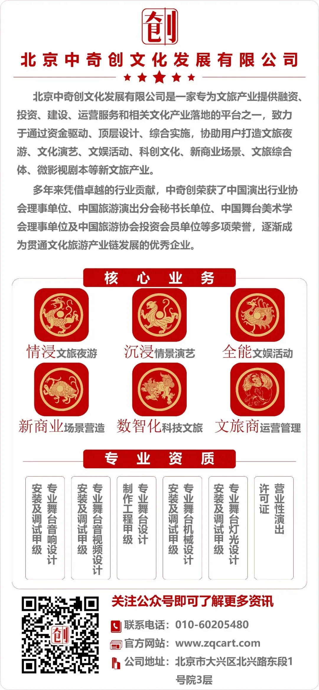 北京中奇创是一家放眼于国际视野、植根本土文化的文化旅游产业全程智力服务专业机构。公司本着“创意为核、文化为魂”的设计原则,专注于文化保护性传承、延展性开发,旨在不断追求文化与旅游的融合创新发展。可提供文化旅游演出、文化旅游景区、文化商业街区、文化主题公园、文化旅游综合体、文化产业园区等的战略策划、整体规划、综合设计及投资运营咨询全程服务。