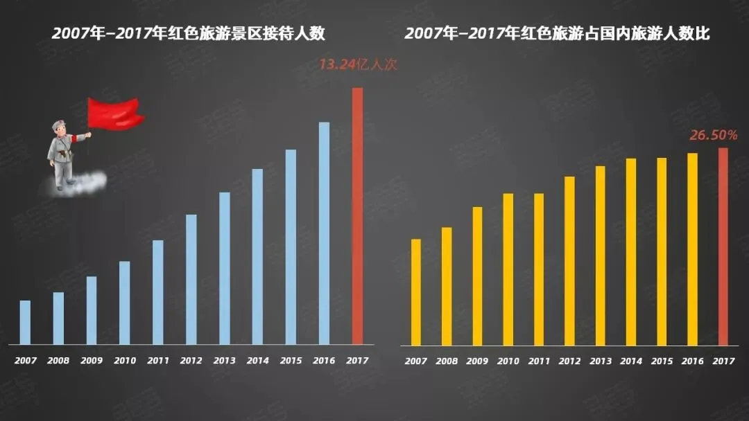 从统计来看,2007年到2017年,全国的红色旅游景区接待的人次从2亿多增长到12亿多,十年时间增长了十倍,发展的非常快。而且可以看出,整个红色旅游占国内旅游人次比已经达到1/4左右。这是一个非常规模宏大的消费体验产品。
