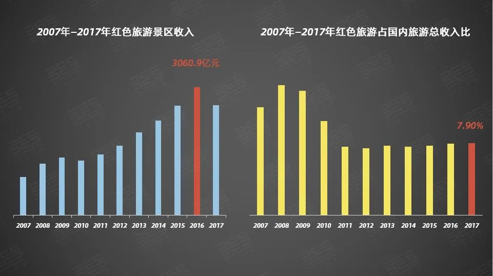习近平总书记曾明确要求,“要把红色资源利用好、把红色传统发扬好、把红色基因传承好”。2007年到2017年,红色旅游每年的收入在不断的增加, 2016年已经达到了3000亿元的水平,在国内旅游的比也在8%左右,红色旅游是当地经济发展的拉手。