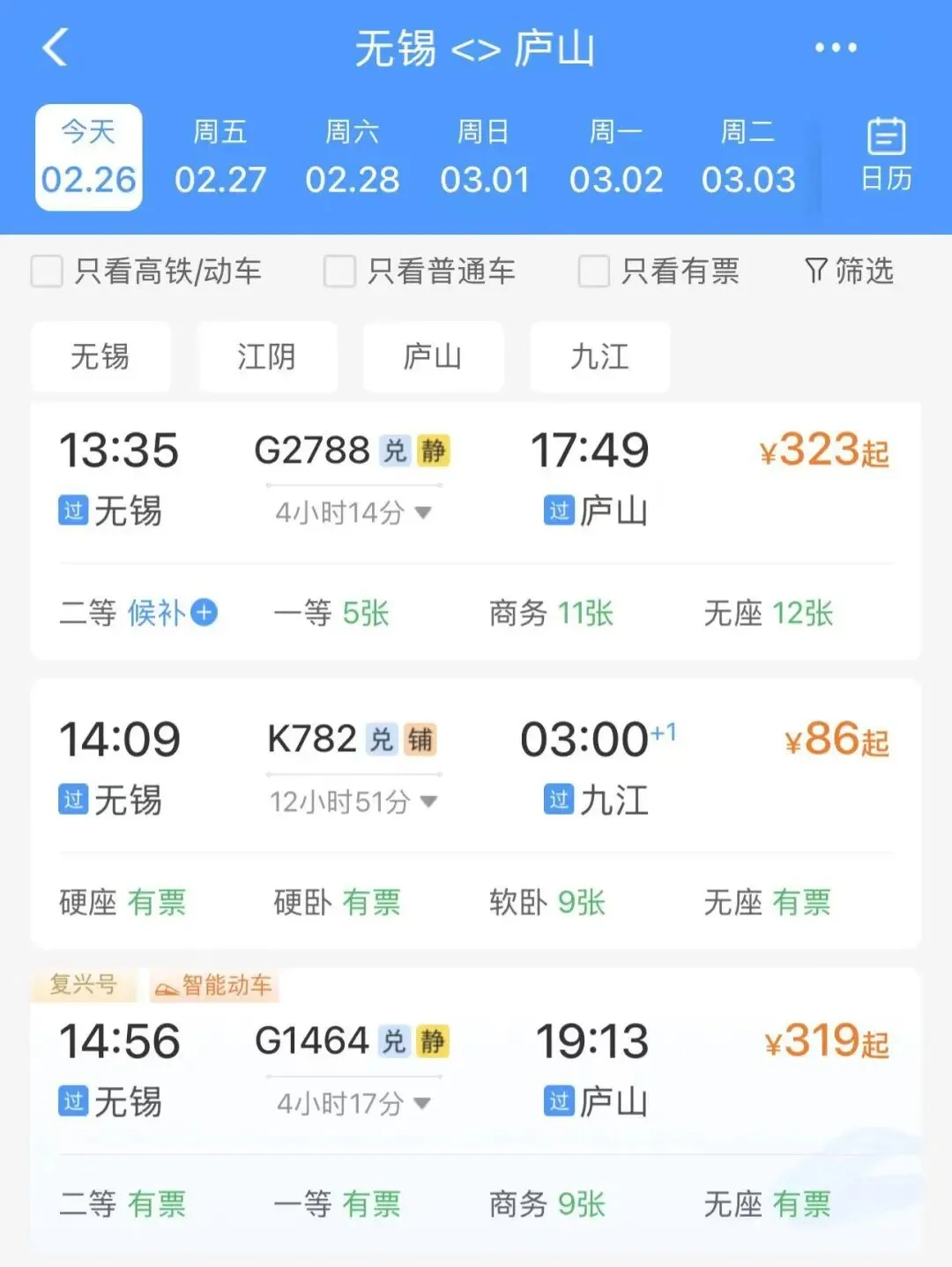 无锡每天有多趟直达庐山的高铁