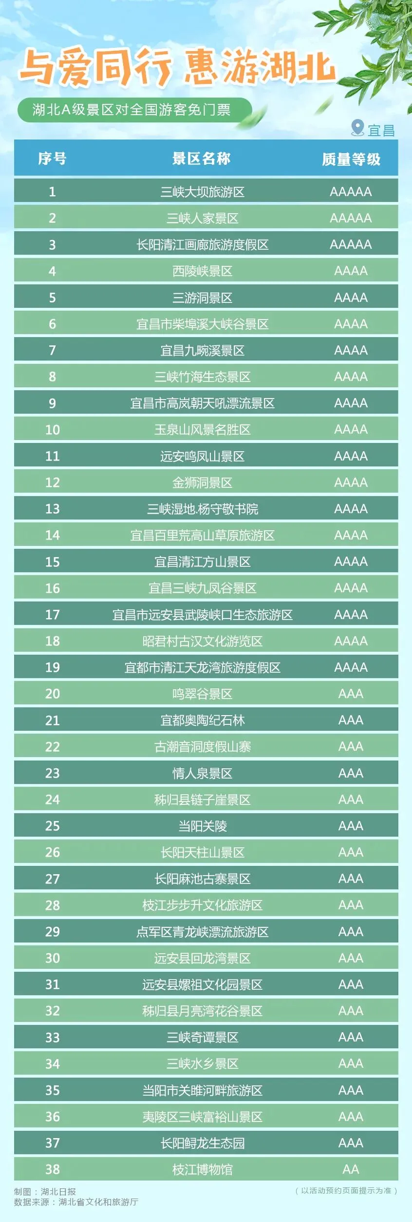 湖北旅游预约平台明日上线 各景区将按照“限量、预约、错峰”开放要求,每日按照核定的日最大承载量的50%进行预约,预约平台将于8月8日正式上线运行。 游客必须在预约有效时间内前往景区,预约时间过期需重新预约;游客预约成功但未入园的情形达到10次,则取消其预约资格。 援鄂医护可带亲属终身免票游湖北A级景区 湖北省还统一制作了湖北感恩卡,发放给每一名援鄂医疗队员,援鄂医护可带亲属终身免票游湖北A级景区。 即可进行预约 免费预约规则 ①本次活动面向全国游客,需使用身份证进行实名预约。 ②每日8:00-21:00可进行预约,可预约当日起7日内景区门票(16:00后不可预约当天门票),预约时需选择游览日期。 ③每位游客(以身份证号为准,下同)每周最多可预约3家景区,整个活动期间每位游客同一个景区最多可成功预约3次,预约成功后不可更改或取消。 ④每次预约最多可填写3位同行人(含本人),均需输入姓名、身份证号码、手机号码进行实名预约。 ⑤预约成功后,可在预约平台“个人中心”查看预约订单,凭本人身份证按指定日期入园(16周岁以下的成功预约者可凭入园二维码进入景区)。 ⑥各景区门票每天限量投放,当天约满即止,未预约成功的用户,第二天可再次进行预约。 ⑦景区内收费游览项目、交通工具等不包含在本次活动中。游客进入景区请遵守疫情防控相关要求,爱护环境、文明旅游。 宜昌预约咨询电话 400-6321-088 下面这份湖北免费景区名单 请收藏好! (注:相关景区免费信息持续更新中, 请以活动预约页面提示为准)