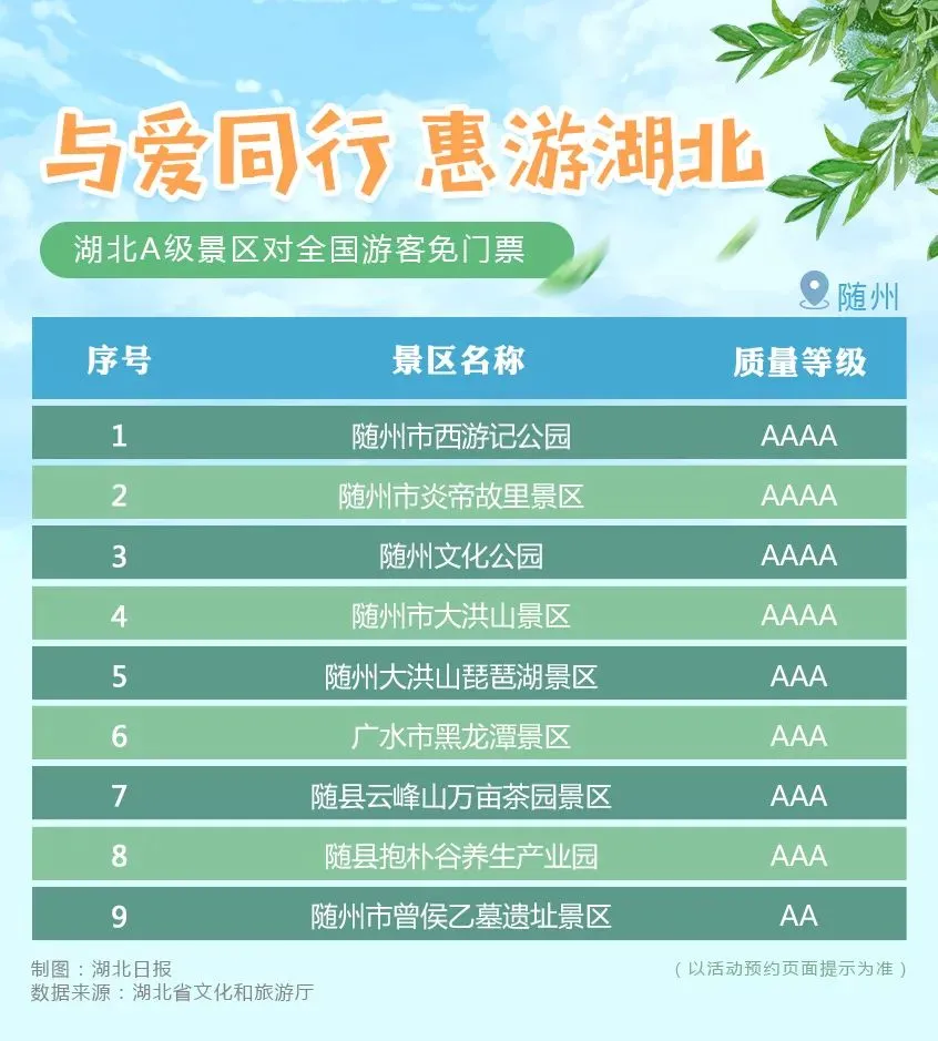 明天起,湖北省A级景区免门票视频来源:央视新闻 今天,湖北省宣布,全省A级旅游景区对全国游客免门票。全国疫情低风险地区游客,需进行实名预约,测温、扫描健康码后进入景区。 湖北A级景区对全国游客免门票开放 持续至年底 据介绍,湖北省所有A级旅游景区自2020年8月8日开始对全国游客免门票开放,一直持续到2020年年底,包括“十一”黄金周在内。旅行社组团游客,同样也可以享受此政策。