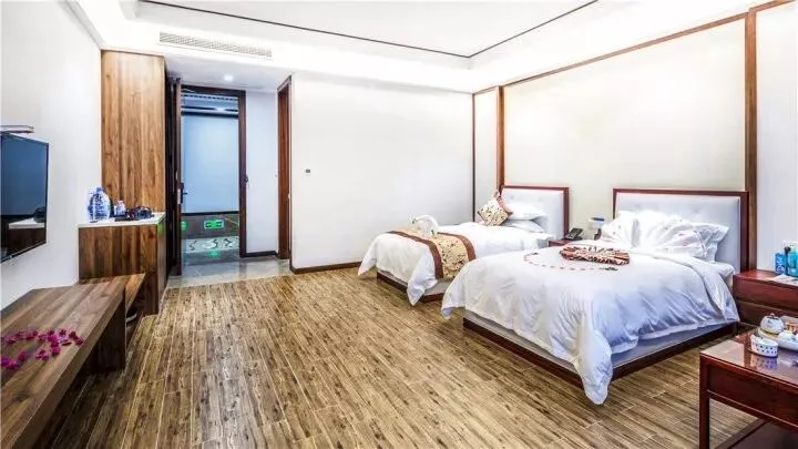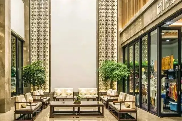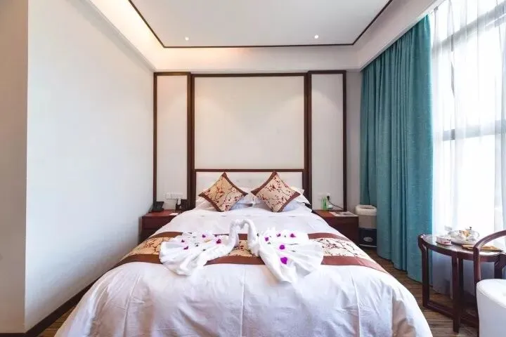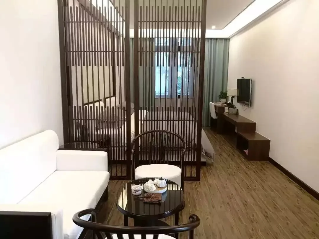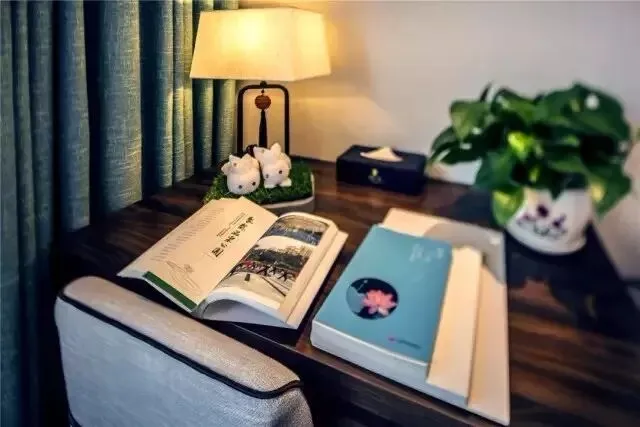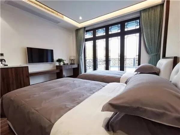 客房里,涵园在细节上做得非常中国风。古典雅致的装潢风格,深色木板、禅意家具、水墨挂画,即使是飘窗的花纹都显现着中式建筑的灵秀。