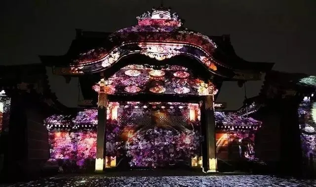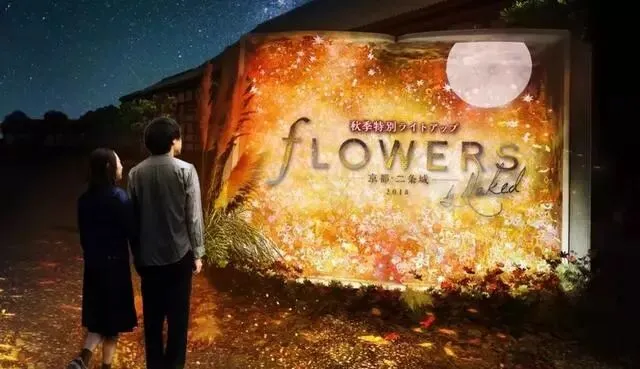 2018年秋天,一场名为Flowers by NAKED 2018的灯光展,以“花和传统”为主题将历史建筑与先进的艺术表现融合在一起。从秋天最具代表性的红叶投影开始,二之丸御殿清所的建筑上出现了随着光线摇摆的芒草田,近距离还能闻到散发出香气的波斯菊。此外,还运用了从室町时代延续下来称作「华道家元池坊」的花道与先进艺术结合在一起、呈现出京都秋天的美轮美奂。