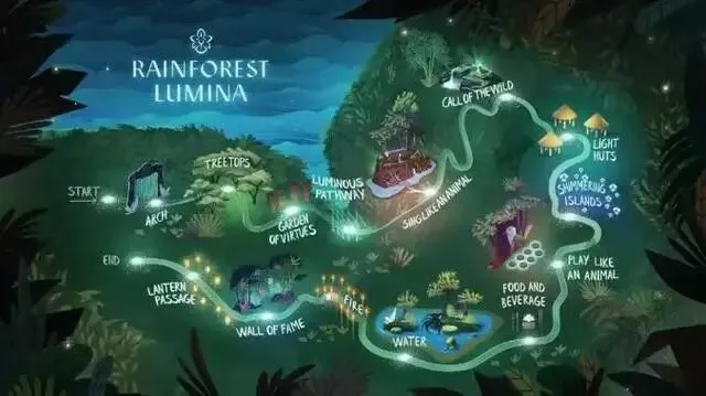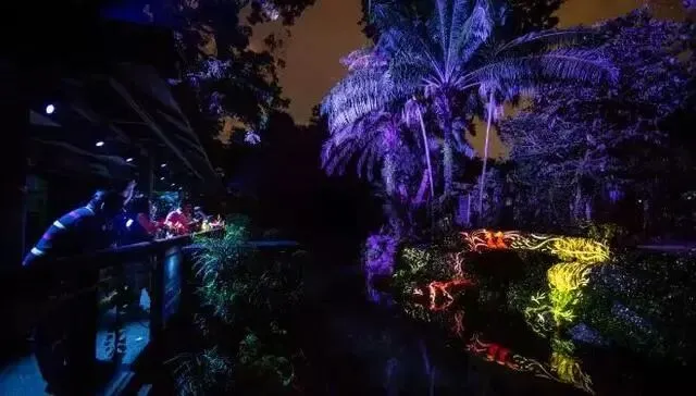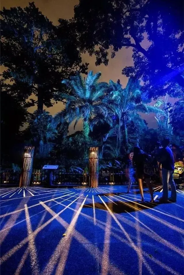 新加坡夜间野生动物园在灯光的使用方面,注重艺术美感。为纪念新加坡动物园成立45周年,动物园还专门推出一个以野生动物园为背景、结合光影和音效的多媒体夜行体验——幻光雨林之夜。幻光雨林全程约一公里,规划了树梢步道、幻光之路、光之木屋、微光岛屿等13个主题,主要由10个区域组成,秉承每个人都可以在雨林里拥有属于自己的专属角色的理念,将故事融入景观之中,引领游客与动物使者邂逅,并在这组怪趣英雄团队的带领下开启一场无与伦比的神奇冒险。