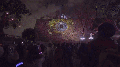 时空之门:石墙上投映着旅行最终乐章的大型影像,例如突然出现了时空隧道、Akiyo跟小精灵们站在石墙上说着话、灯光不断的转变特效等等。