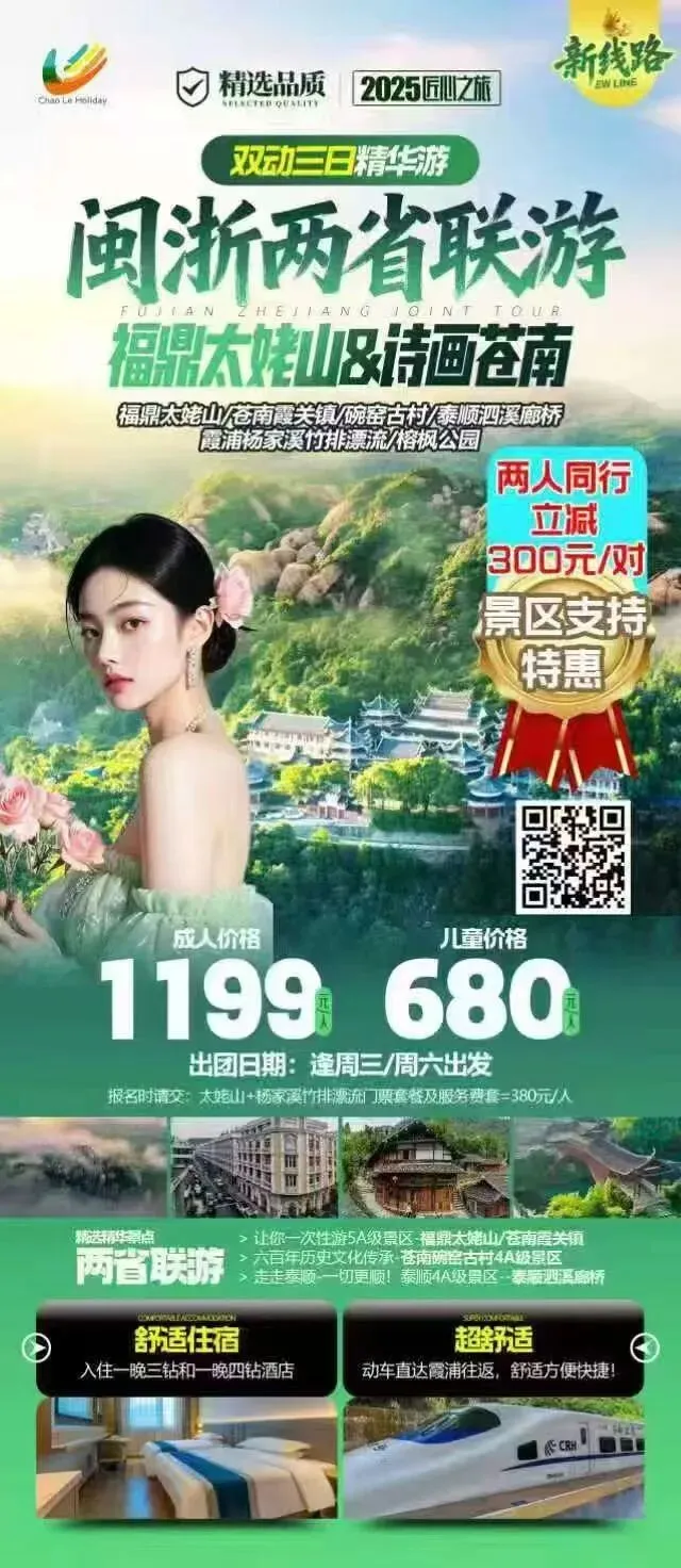 【东弘旅游】景区支持特惠---两人同行立减300元/对,新线路--闽浙两省联游三天