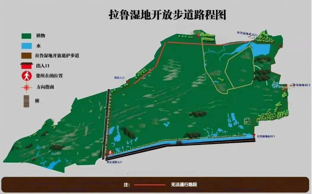 拉鲁湿地目前开放的巡护步道共设5个出入口,具体位置如下: