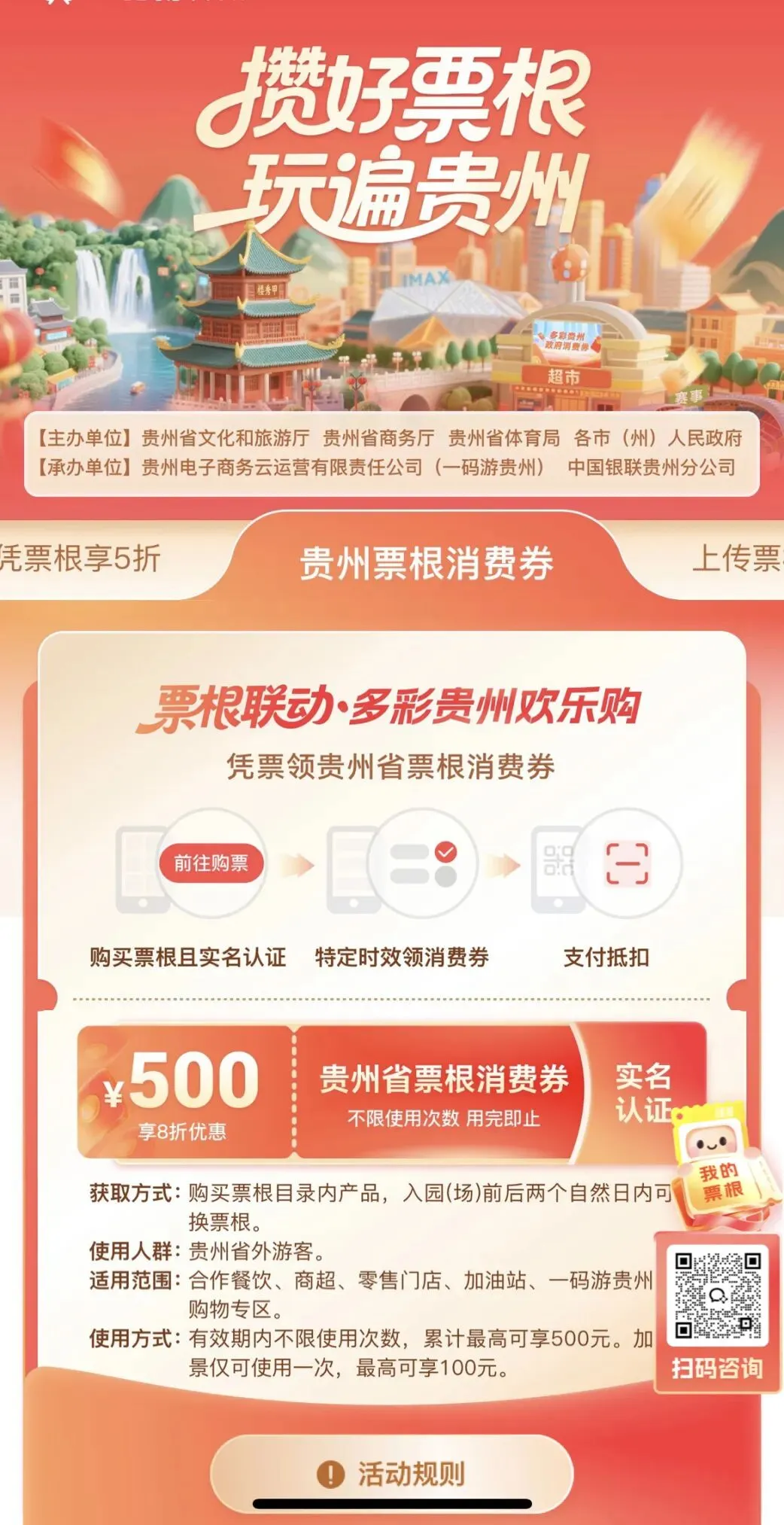 怎么使用:打开【一码游贵州】平台,首页点击【攒好票根·玩遍贵州】专区,选择【上传票根享优惠】页面,上传相关票根,即可获得【一码游贵州】平台专属消费券。