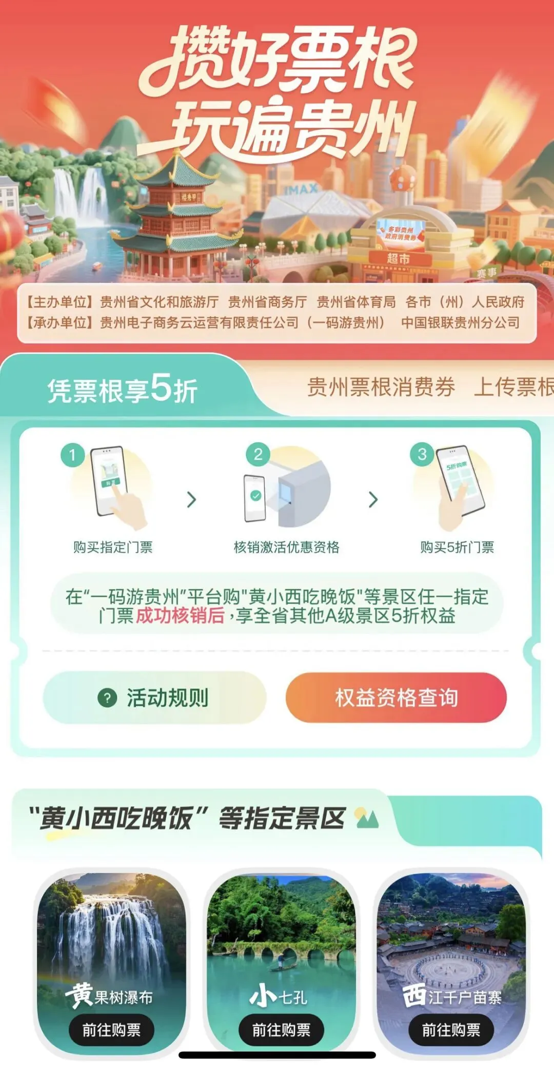 购买上述门票并完成核销后,5天内打开【一码游贵州】平台首页,点击【攒好票根·玩遍贵州】专区,选择【凭票根享5折】页面,找到【权益资格查询】,完成票根核验,核验通过后即可购买相关景区门票,享受5折优惠。