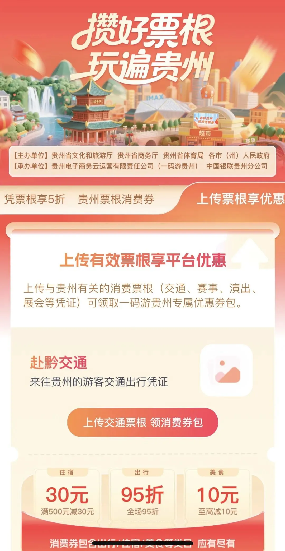 只要在【一码游贵州】平台,上传贵州相关消费票根(交通、赛事、演出、展会等),就能领取平台专属优惠券包!