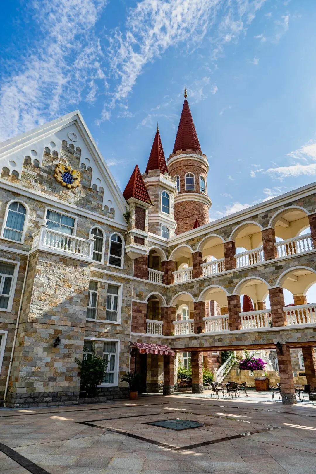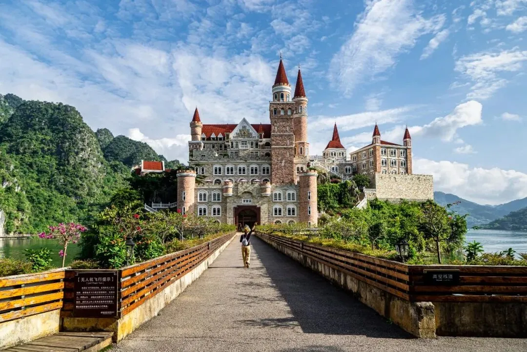 吉隆堡是一个极具特色的景点。它是一座建在万峰湖湖心岛上的欧式城堡,被誉为“中国版天鹅堡”。