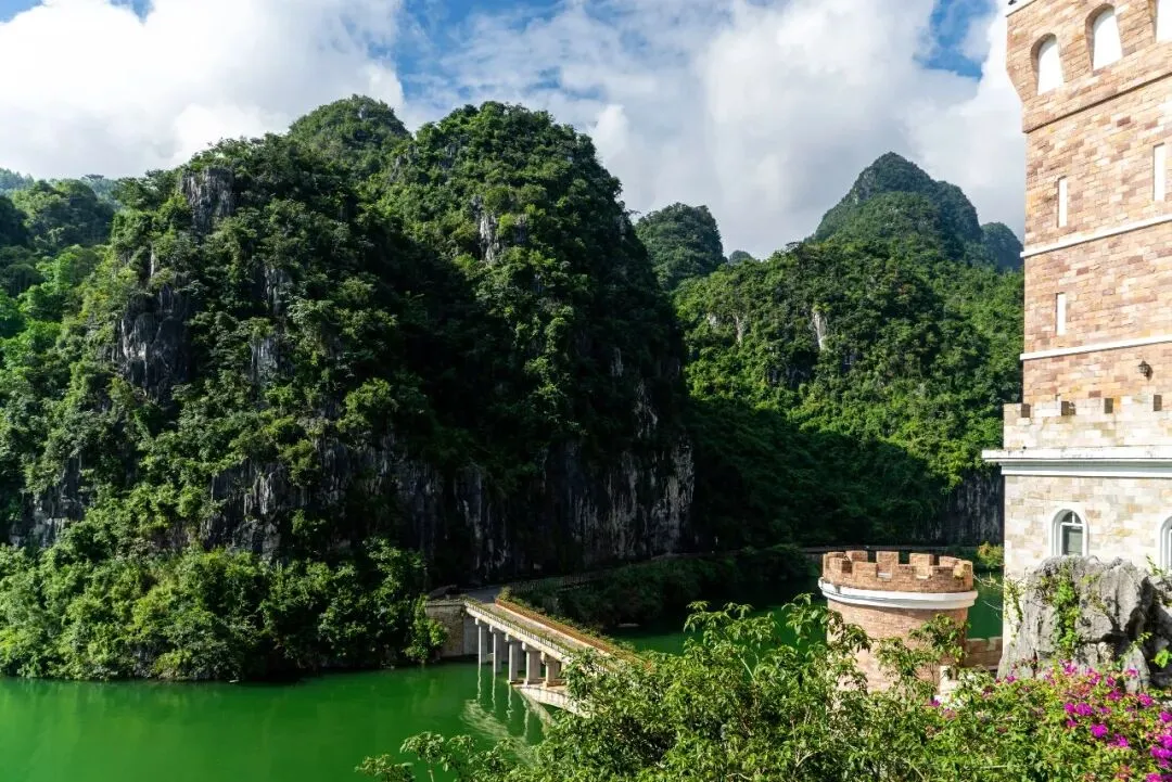 最吸引人的,就是城堡本身。它孤独地矗立在碧绿的湖水中央,背后是层峦叠嶂的喀斯特山峰,构成了一幅既奇幻又和谐的画卷。站在远处,或是在桥上拍照,很容易就能拍出仿佛置身欧洲的大片。