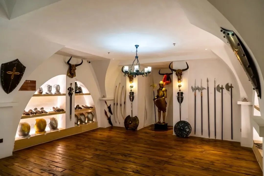 城堡内部结构犹如迷宫,设有中世纪风格的展厅,陈列着骑士铠甲、古老武器等展品。游客还可以戴上王冠拍照,体验感十足。