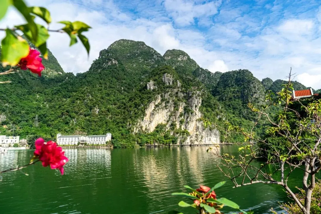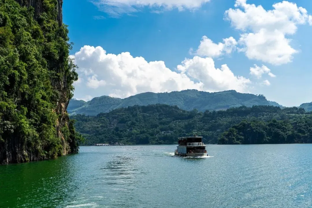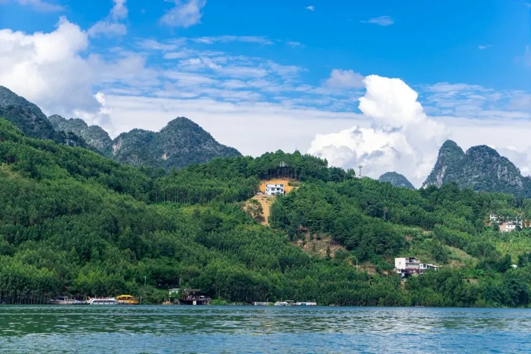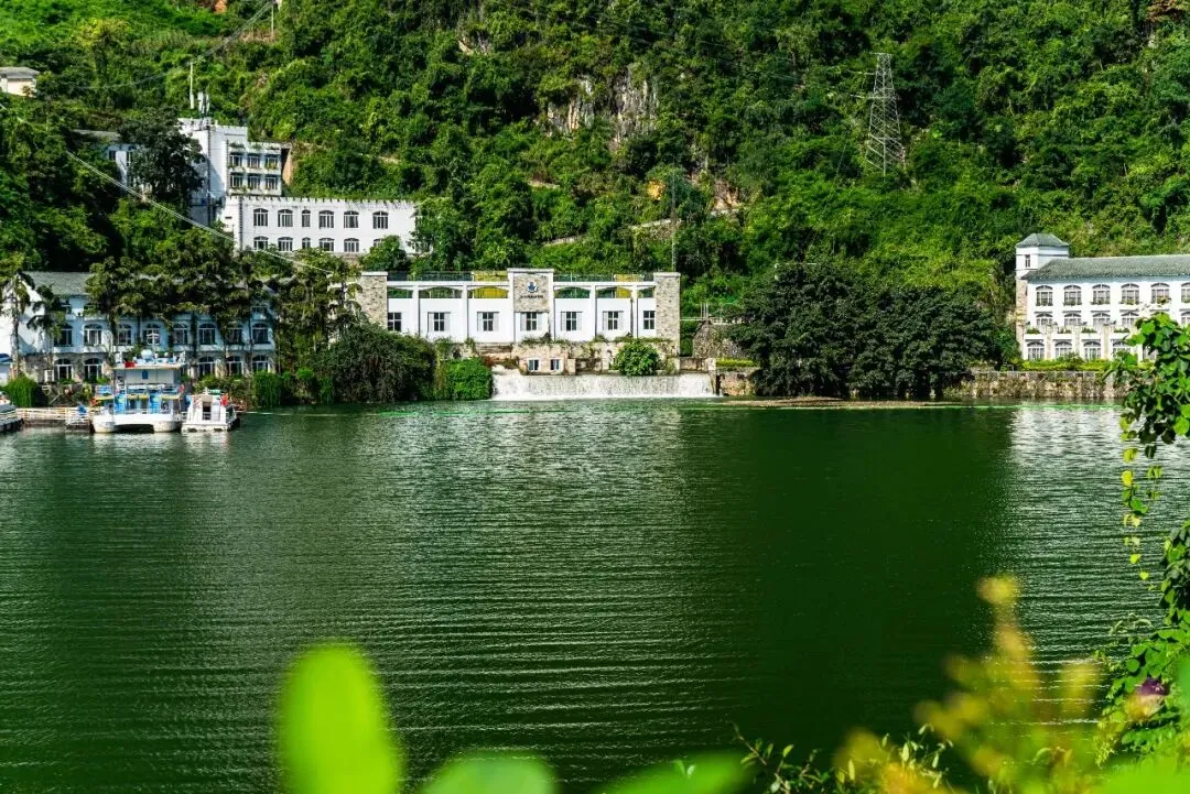 从吉隆堡码头可登上游艇,环绕湖面游览约四十分钟。码头附近建有一座水电站,利用纳灰河水进行发电的。纳灰河蜿蜒穿过万峰林核心景区,滋养着沿途的田园村寨,是构成峰林田园画卷的灵魂所在。