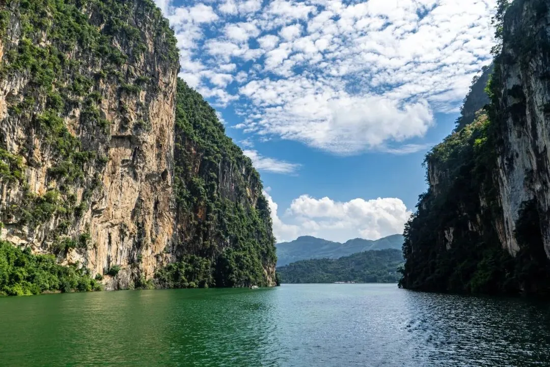 游船行驶的最远处是马岭河河口。马岭河流经著名的马岭河峡谷,最终在兴义市南盘江镇的红椿码头附近注入万峰湖。