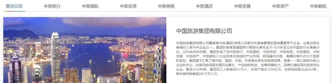 中国旅游集团有限公司暨香港中旅(集团)有限公司是中央直接管理的国有重要骨干企业,也是总部在香港的三家中央企业之一,前身是 1928 年设立的中国旅行社香港分社,深耕文旅行业近百年,是唯一一家以旅游为核心主业的央企。集团构建起由中旅旅行、中旅国际、中旅投资、中旅免税、中旅酒店等八大业务单元组成的全文旅产业体系,旗下汇聚港中旅、国旅、中旅、中免(全球最大旅游零售商)等众多知名品牌,形成了覆盖 “吃住行游购娱” 全链条的旅游服务网络。
