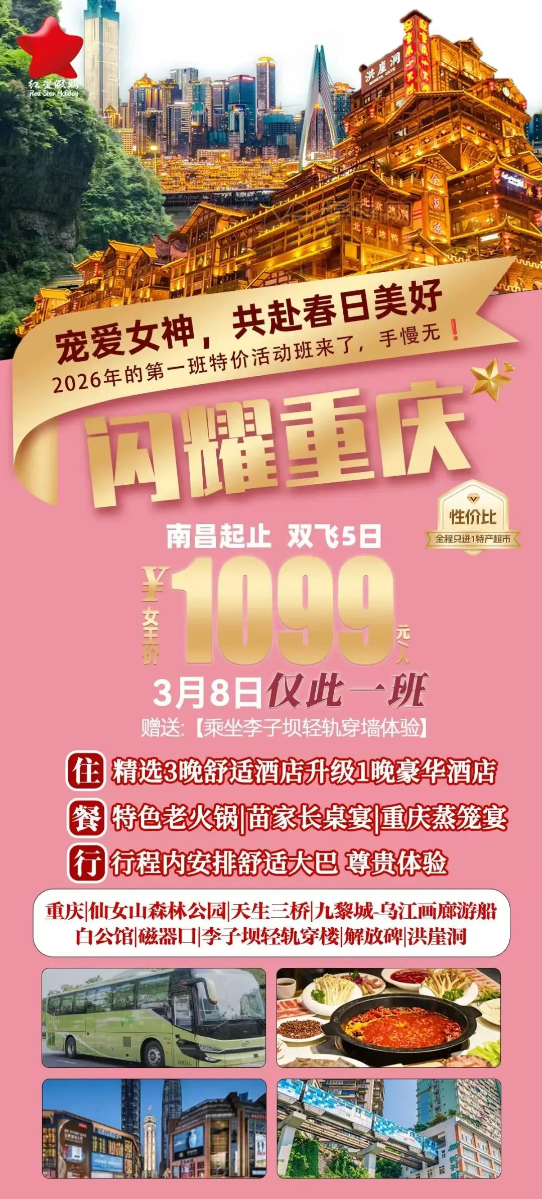 您现在的位置是:首页 > 国内旅游目的推荐 > 正文 国内旅游目的推荐 【潮人旅游】3月8日闪耀重庆女神节专享,双飞五日游 admin2026年02月26日 18:49:27国内旅游目的推荐10 【潮人旅游】3月8日闪耀重庆女神节专享,双飞五日游🔥3月8日闪耀重庆女神节专享!✈南昌起止双飞五日游1099📣仅此一班!手慢无!🏨3晚舒适酒店+1晚豪华升级🍲老火锅+苗家长桌宴+蒸笼宴🚗舒适大巴+李子坝轻轨体验#洪崖洞#仙女山#天生三桥☎️18107050172(微信同号)咨询电话:18107050172(微信同号)长按添加咨询也欢迎进店咨询信息发布 广告宣传旅游交友 婚姻介绍都可以来奉新信息网↓↓咨询电话:18107050172、15079532799 转载请说明来源于"旅荐网",部分内容转载自网络,如有侵权请联系qlwl@foxmail.com删除 本文地址:https://www.15386.cn/post/124946.html 上一篇 瞰影城 | 从环球影城周边开始做旅游攻略,你可以这么玩 下一篇 一知名景区:对全体海内外游客免门票 相关文章 2026五一旅行指南 三亚旅游跟团纯玩无购物的路线规划,五一经典路线+费用透明攻略 广州旅游攻略(纯干货版)之一:交通和住宿篇 温湛滨研究部署滨海旅游路规划建设工作 并到现场调研 关于举办2026年第二十届全国大学生文化旅游与会展竞赛(原全国高校商业精英挑战赛文旅与会展创新创业实践竞赛)新疆赛区的通知 1小时直达!西安→宝鸡五一反向旅游攻略! 用AI帮你做旅行攻略,比小红书靠谱10倍 桂林旅游计划 人均700️桂林阳朔旅游攻略(超详细) 全城寻光 | 旅行故事*在地摄影师招募计划,无门槛,只认好作品 发表评论 取消回复 评论列表 这篇文章还没有收到评论,赶紧来抢沙发吧~