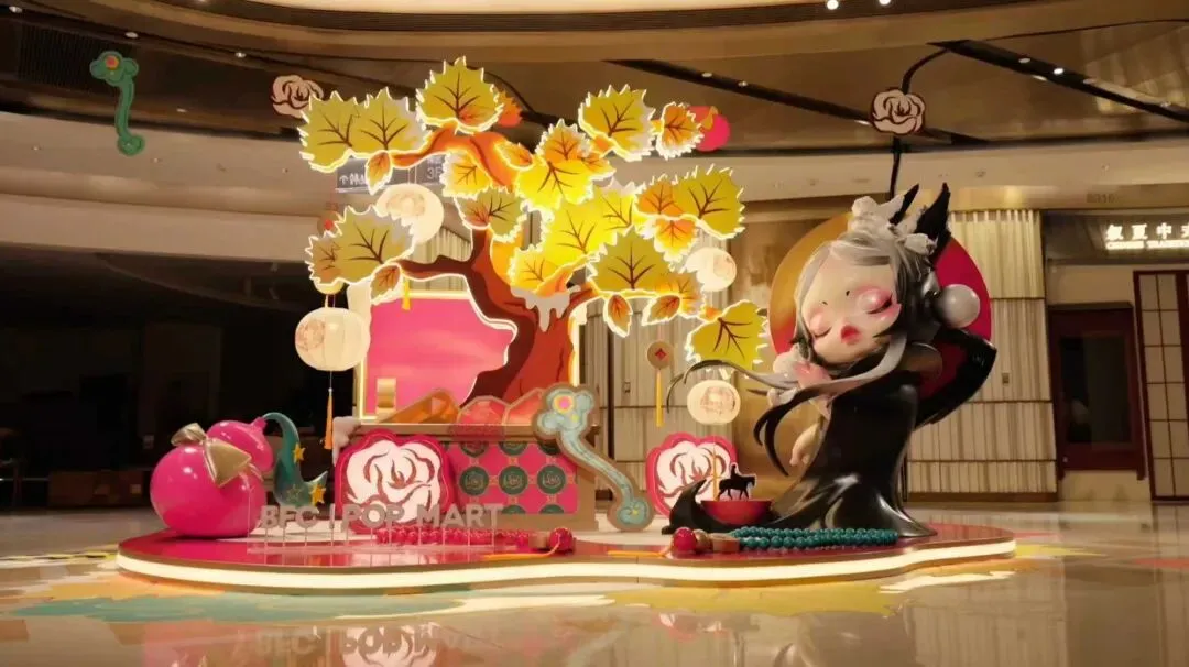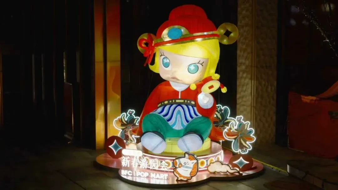来到BFC,风尚潮流灯区联合泡泡玛特打造潮流年味新体验。北区广场,一座别出心裁的宫灯旋转木马装置点亮新春夜空:传统宫灯的朱红飞檐下,暖黄灯箱勾勒出12个泡泡玛特经典IP形象,宛如将童话藏入中式画框;下层木马在光影中交织出马年的奔腾意象与喜庆的年节氛围;宫灯一侧,LABUBU的萌趣灯组与旋转木马相映成趣。