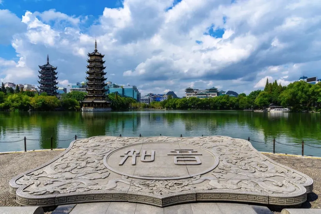 桂林文化新地标【日月双塔】(游览约30分钟)外观,国家AAAAA级景区,日塔、月塔与象山上的普贤塔、塔山上的寿佛塔,相互呼应,相互映衬,有“四塔同美”之说,桂林日月双塔号称世界第一铜塔。