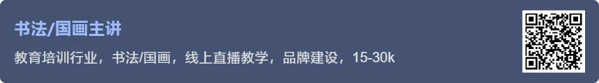 书法/国画主讲 https://www.zhaopin.com/jobdetail/CC120196430J40985747204.htm 来源: 智联招聘 团队: 北京和众运输集团 摘要: 教育培训行业,书法/国画,线上直播教学,品牌建设,15-30k |
