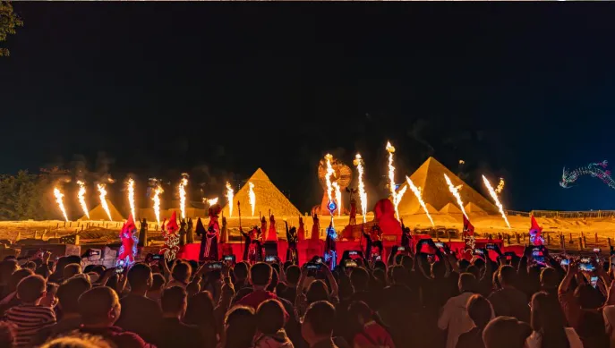 作为宣传重头戏的新演艺《埃及艳后》 成为春节假期的“王炸”,这部融合了古埃及文明与未来科技的科幻实景剧,以其震撼的视听效果吸引了大批游客观演;世界文化史诗系列开篇巨制《拿破仑传奇》也新春精彩继续,为游客带来沉浸式的观演体验,其中的“科技烟花秀”更是登上短视频平台热点。