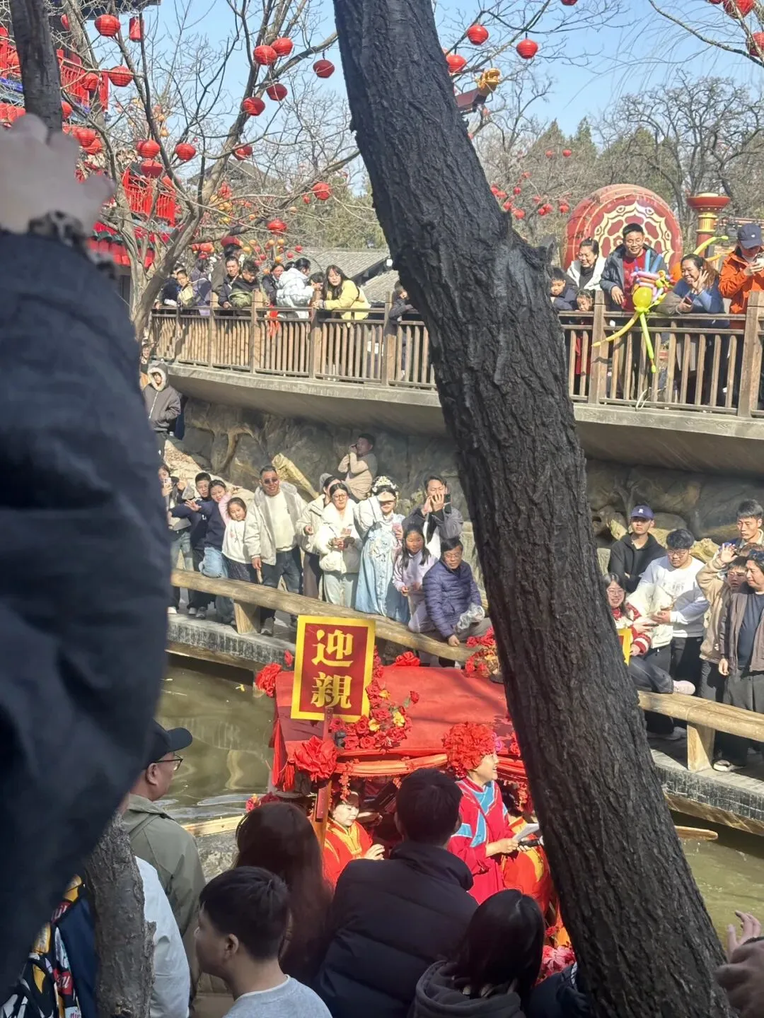 路上正好碰上“水上迎亲”节目不敢多逗留,预约的11点祝家庄演出,抬头天上还有超火的小火车也看到了~