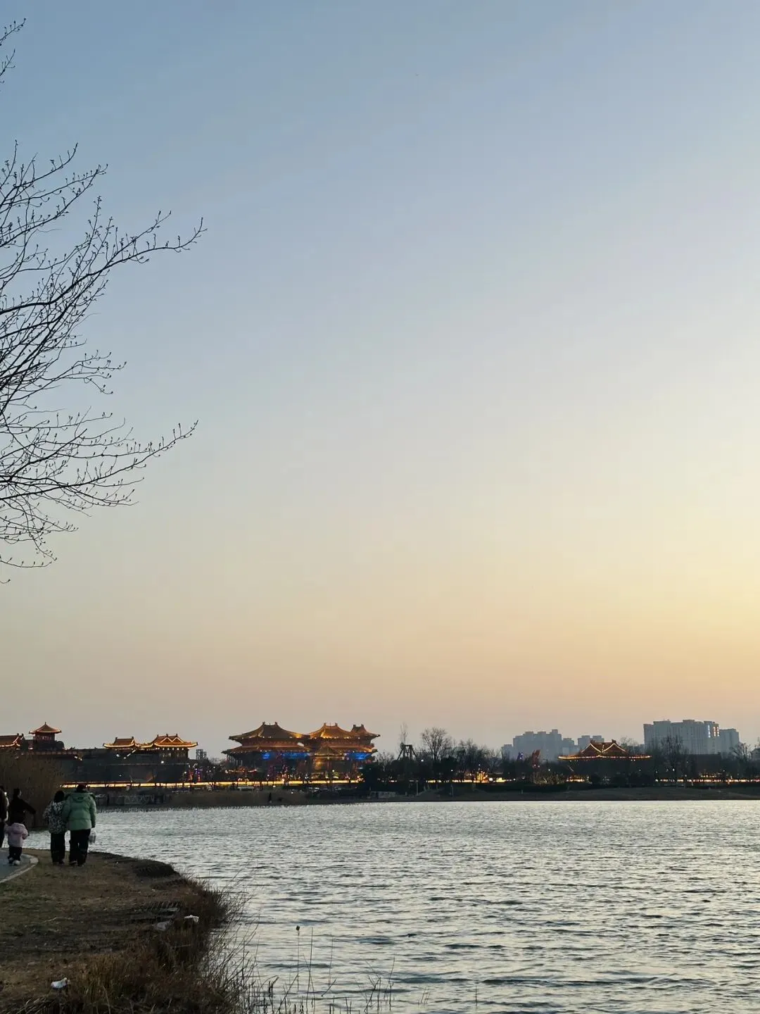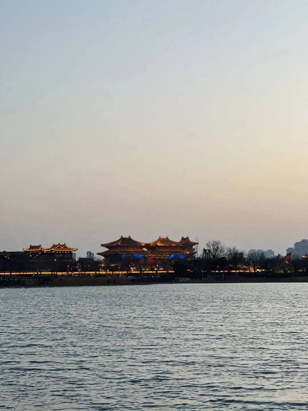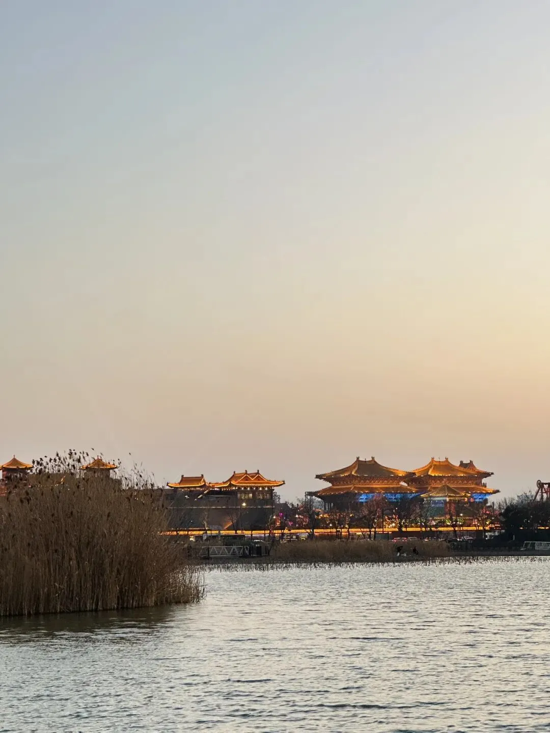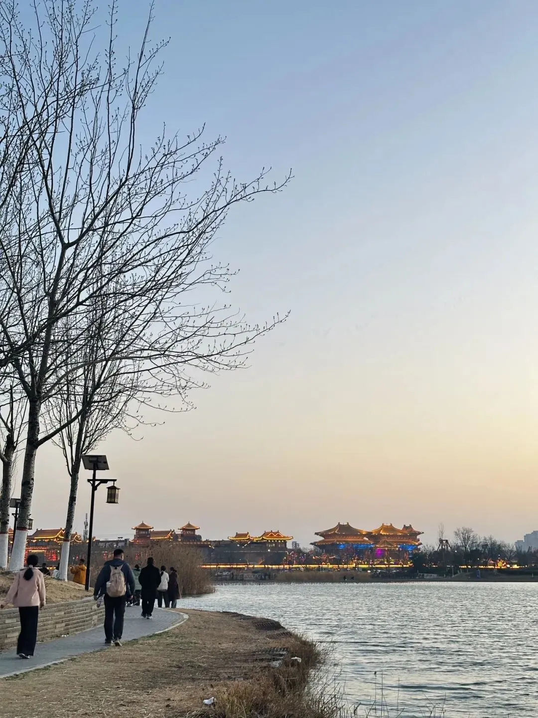 出来南门直走会路过一片河岸对面就是清明上河园,夕阳下绝美~