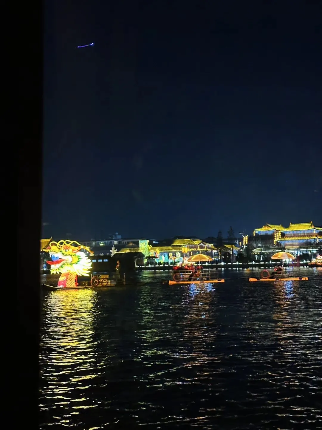 游船也漂亮,对面有龙舟船,还有好多水上表演项目演出,古代双人舞,特别有美感,真的太累,没有站起来好好拍,大家浅看一下吧,节目应接不暇,手机夜景老是拍不好,现场更美更梦幻,值得一坐~