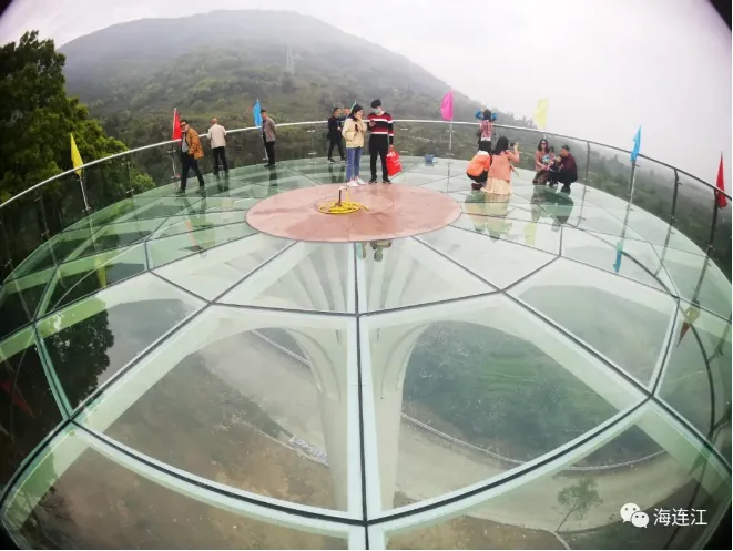 观景平台高15米,直径13米,基础孔桩近10米,采用三层钢化夹胶玻璃建造而成,一平米可承重一吨左右,整个观景平台最多可容纳一百多人。