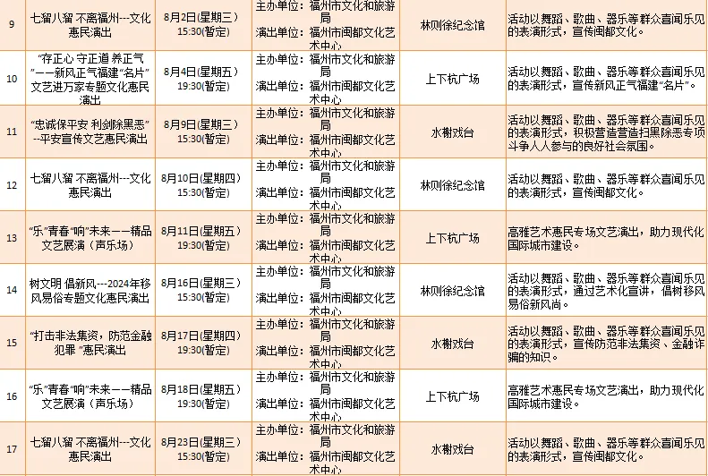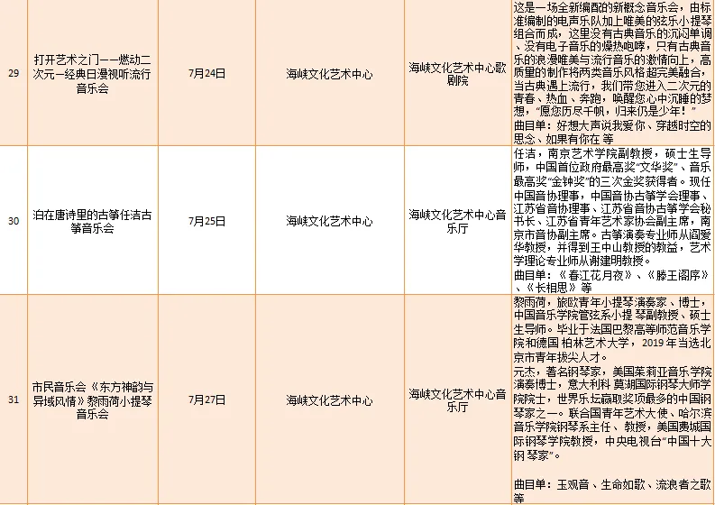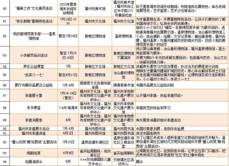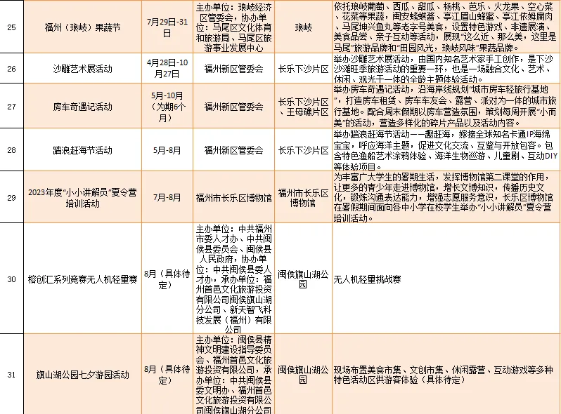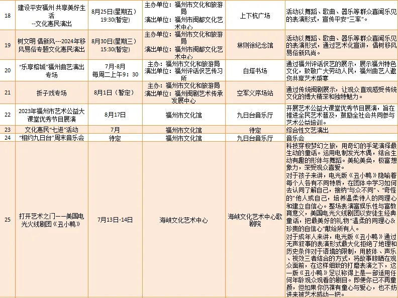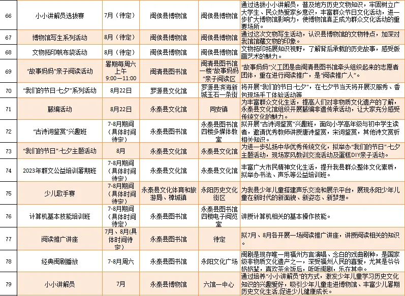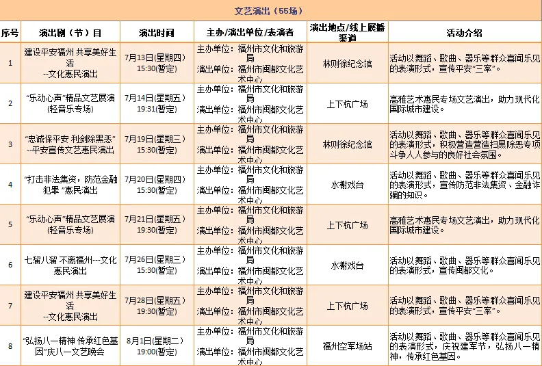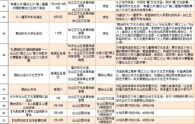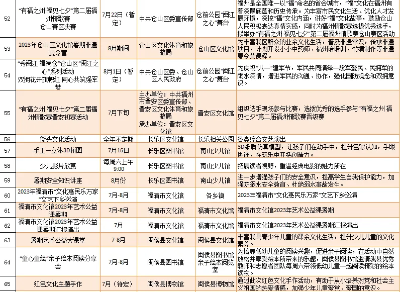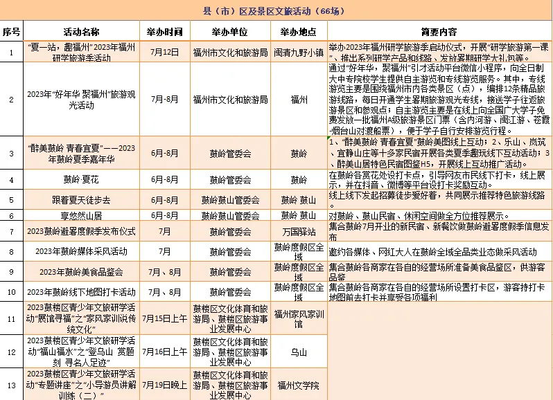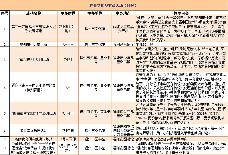 云宿鼓岭·相约‘宜夏’——2023鼓岭避暑度假季活动、鼓岭·八闽美食嘉年华活动、福州市福派民宿生活季活动、七溜八溜 不离福州——文化惠民演出、“乐动心声”精品文艺展演(轻音乐专场)、“乐”青春“响”未来——精品文艺展演(声乐场)、保利剧院打开艺术之门系列演出等,以及2023年福州市艺术公益大课堂优秀节目展演……内容多样,形式各异,十分精彩!