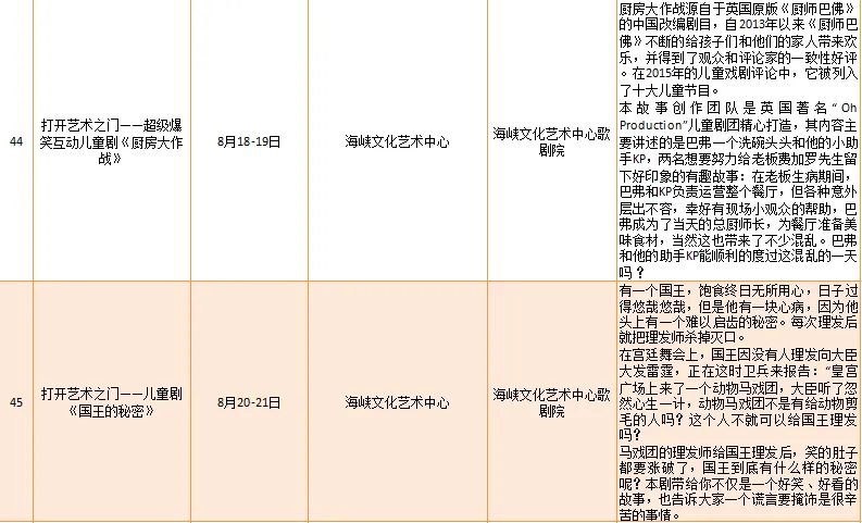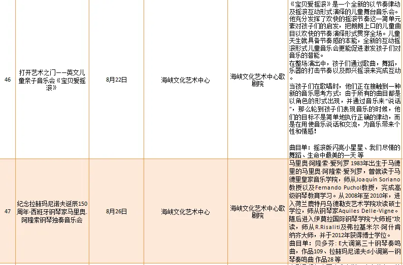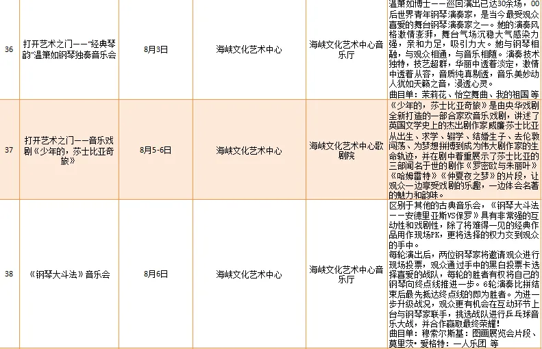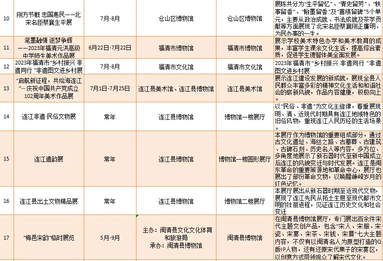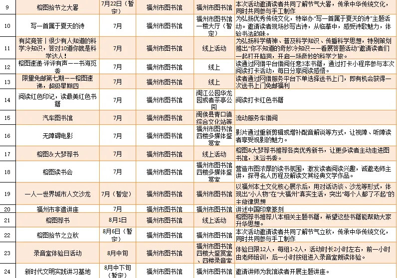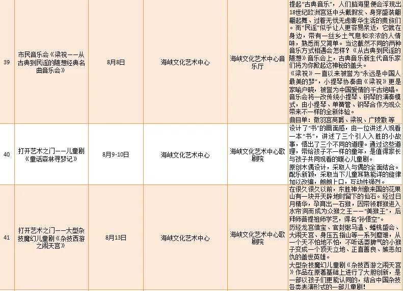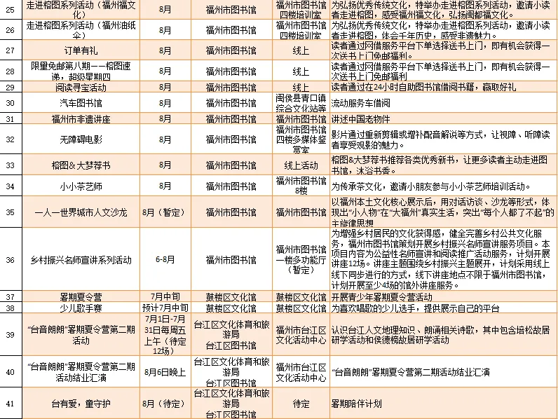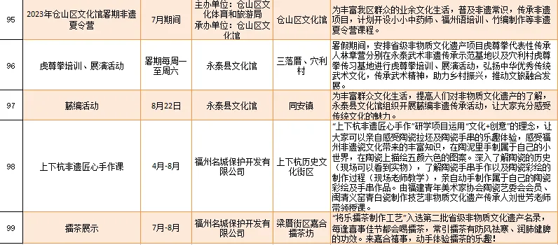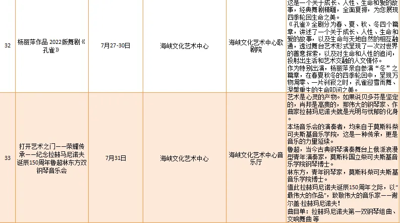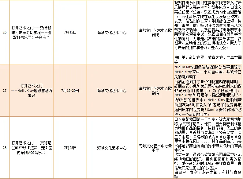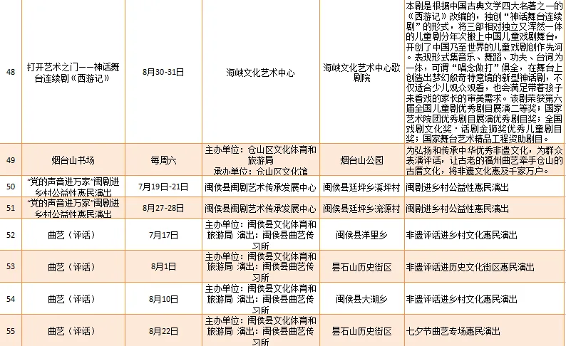 云宿鼓岭·相约‘宜夏’——2023鼓岭避暑度假季活动、鼓岭·八闽美食嘉年华活动、福州市福派民宿生活季活动、七溜八溜 不离福州——文化惠民演出、“乐动心声”精品文艺展演(轻音乐专场)、“乐”青春“响”未来——精品文艺展演(声乐场)、保利剧院打开艺术之门系列演出等,以及2023年福州市艺术公益大课堂优秀节目展演……内容多样,形式各异,十分精彩!