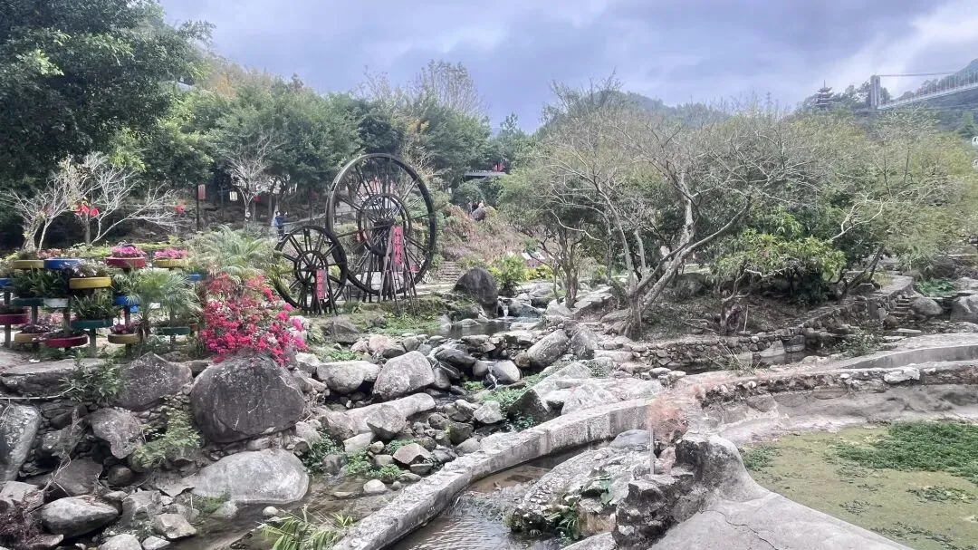 几辆环山小火车吸引了一些老人家和小朋友。继续前进,先去会会樱花花海。樱花树种在山坡上,几十棵树只见花不见叶,在绿色的大山上这一片粉红色成了特别的点缀!