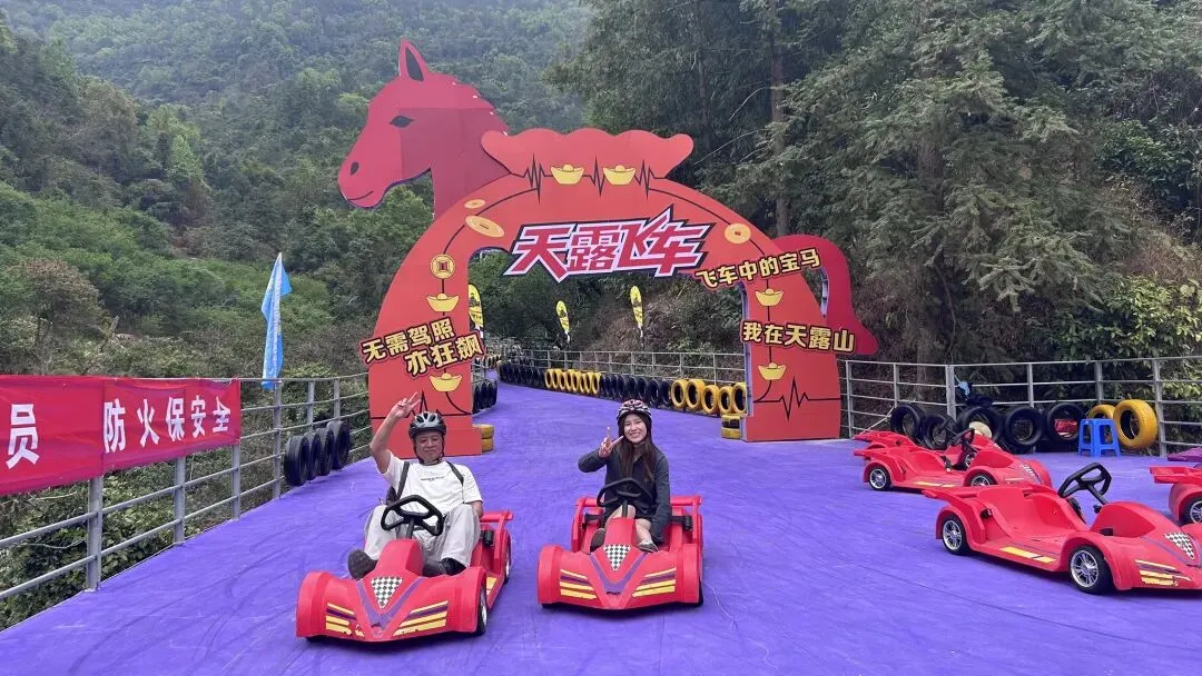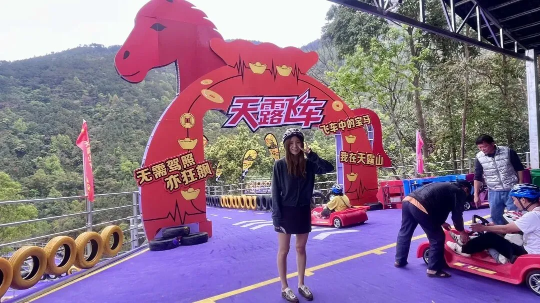 大家一下子都热情起来,来玩一玩吧。爬山上来开飞车下去,一举两得。大人小孩统一票价68元。戴上头盔,每个人都成了酷帅的飞车党。