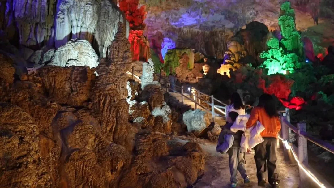 春节的三门海景区,阳光穿透天窗,将水面映照成梦幻的蓝绿色,钟乳石在灯光下千姿百态,与洞外的明媚春光形成鲜明对比,构成了一幅独特的新春画卷。