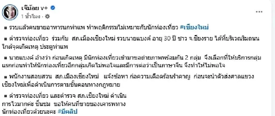 此事引起清迈警方的高度重视,旅游警察与当地警局迅速联动,将涉事者(30岁男子)抓获。目前,该男子因“寻衅滋事及滋扰游客”被移送法院,警方明确表示,此类破坏旅游形象的行为绝不姑息。