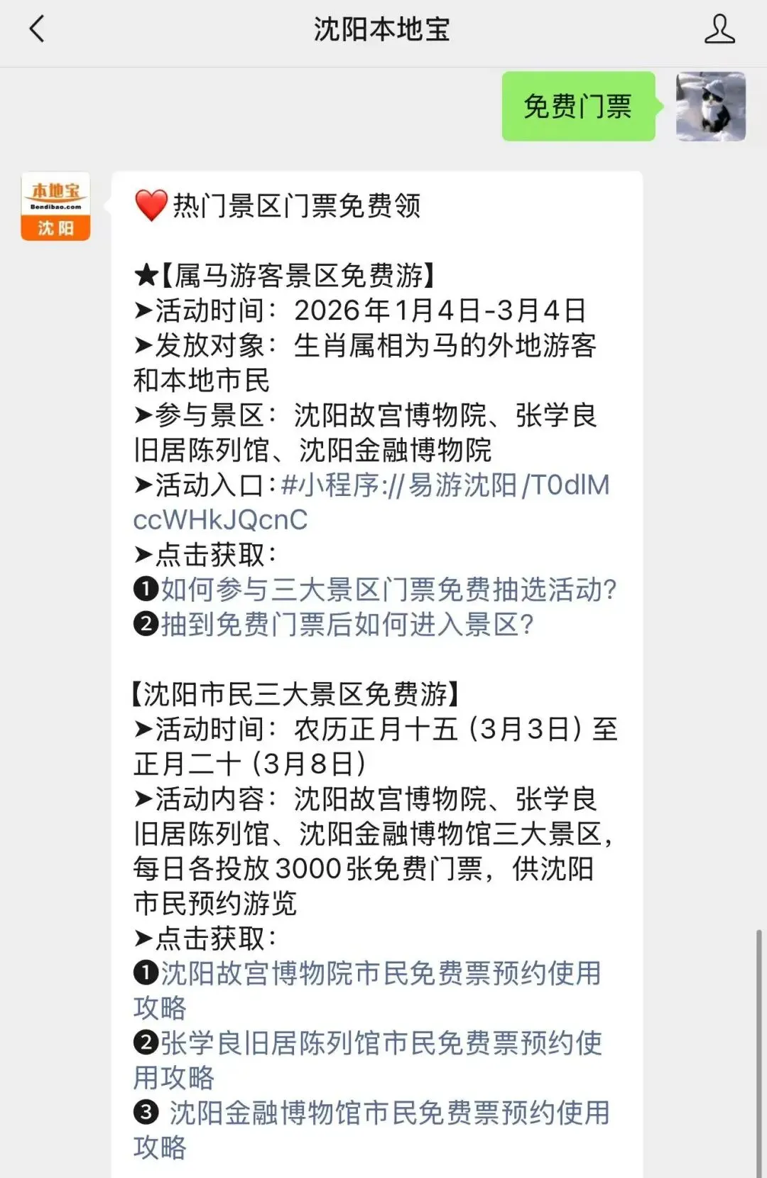 回复【免费门票】获取沈阳热门景区免费门票活动内容