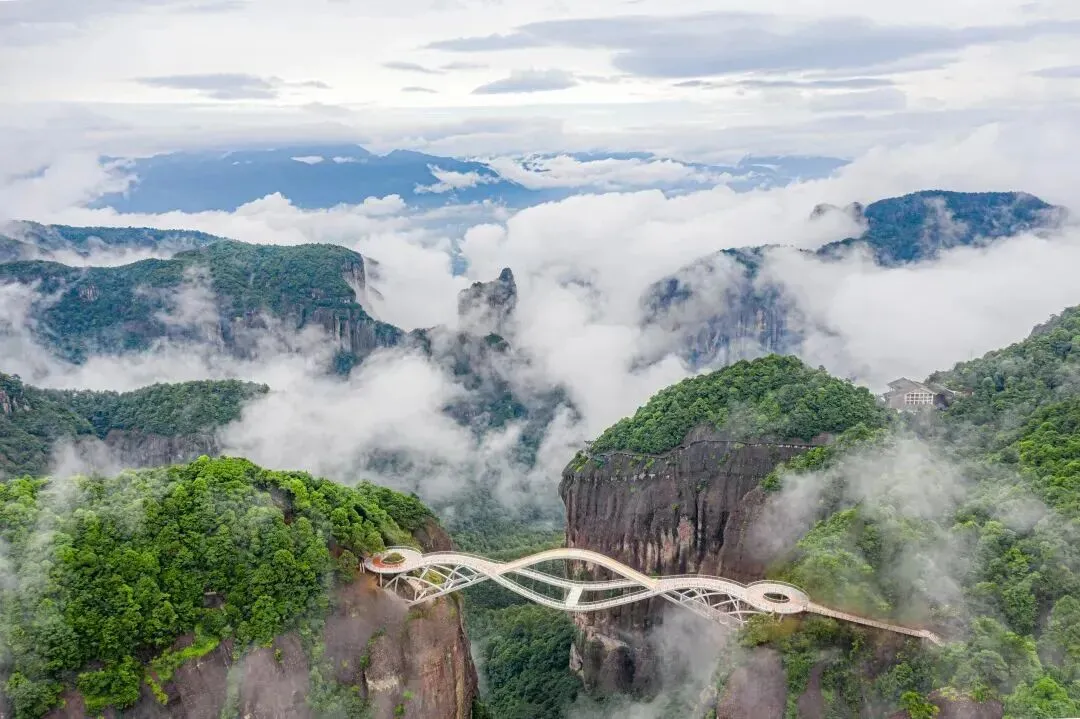 山下是江南峡谷的柔情风光,山上则千峰林立,气象恢宏。乘坐缆车缓缓而上,百米高的栈道凌空蜿蜒,鸟鸣在山谷间回旋,云雾在脚下翻涌,移步换景,如行走在云端画廊。