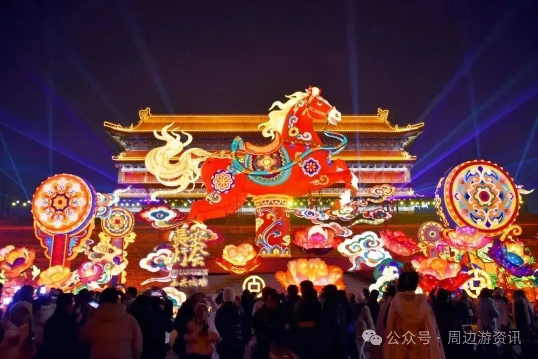 2026大同古都元宵灯会以 “万马奔腾中国年・风起东方耀大同” 为主题,将北魏文化与现代光影完美融合,是北方元宵赏灯的标杆之地。古城墙四面悬挂 46组主题灯组,既有展现云冈石窟艺术、魏碑书法的北魏文化灯组,也有哪吒、花木兰等国潮IP灯组,夜晚华灯齐放,映照巍峨城墙,气势恢宏。