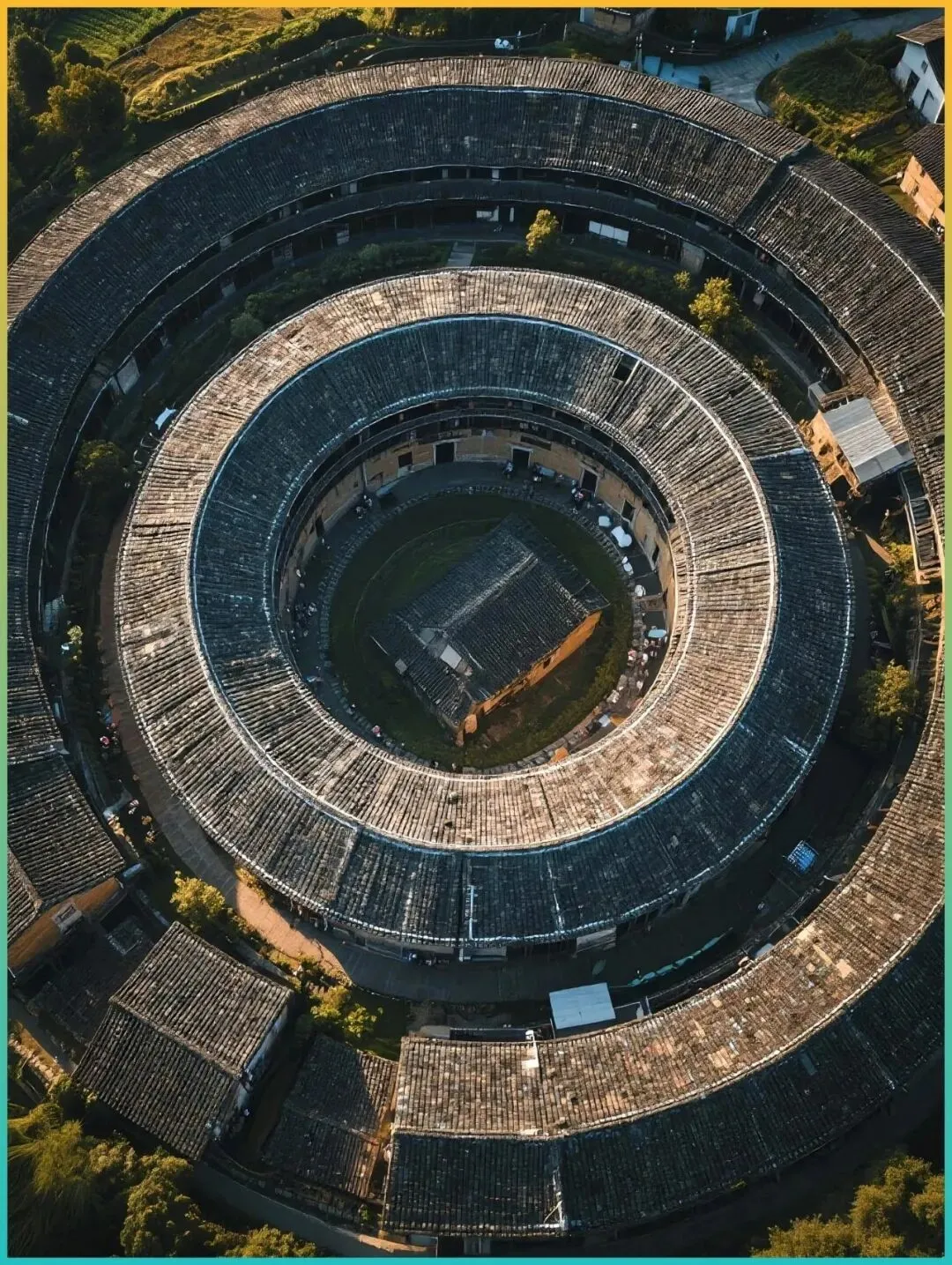 这可能是“平替丽江”里最特别的一处。圆形土楼如一枚印章,印在山坳里。