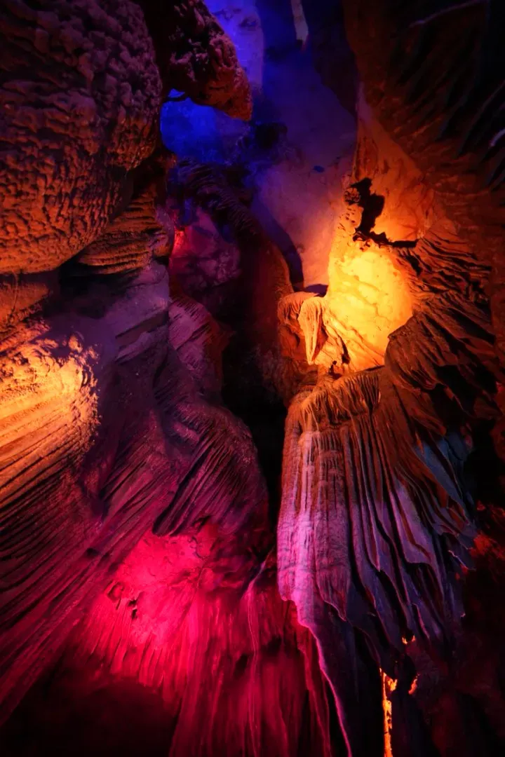 踏入溶洞,各种钟乳石、石笋、石柱、石幔琳琅满目,姿态万千。有的如利剑直插云霄,有的似仙女翩翩起舞,还有的像动物憨态可掬,令人目不暇接,浮想联翩。