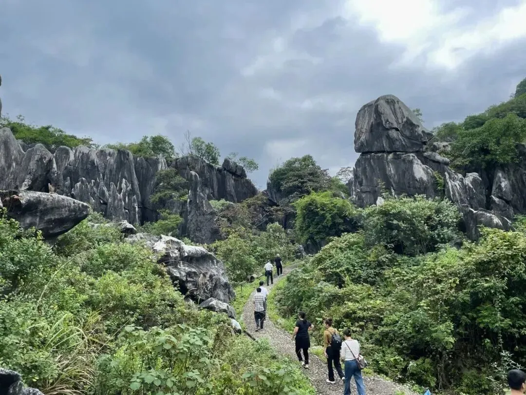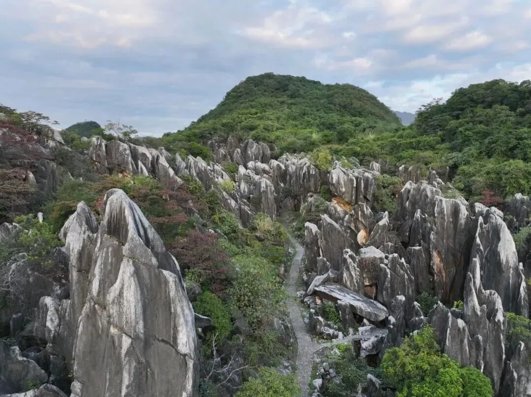 贺州玉石林位于平桂区黄田镇,是一片十分罕见的由汉白玉石柱、石笋组成的“玉石林”。景区内峰丛间石芽裸露、奇峰突兀,成就了“财神”“南国雪原”“石林迷宫”“一线天”等众多的奇异自然景观。它独立于四周的石灰岩山中,被游人誉为“人间仙境”,被地学专家称作地质奇迹。