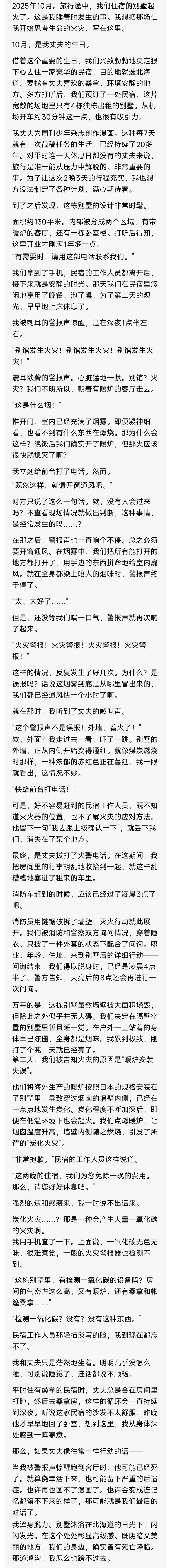 概括来说就是:平常忙得脚不沾地的小夫妻好不容易出去旅个游,租了个别墅,结果因为装修问题、工作人员极其不称职、甚至连一氧化碳检测器都没有等问题,导致遭遇了由装修不合规壁炉引起的炭化火灾。
