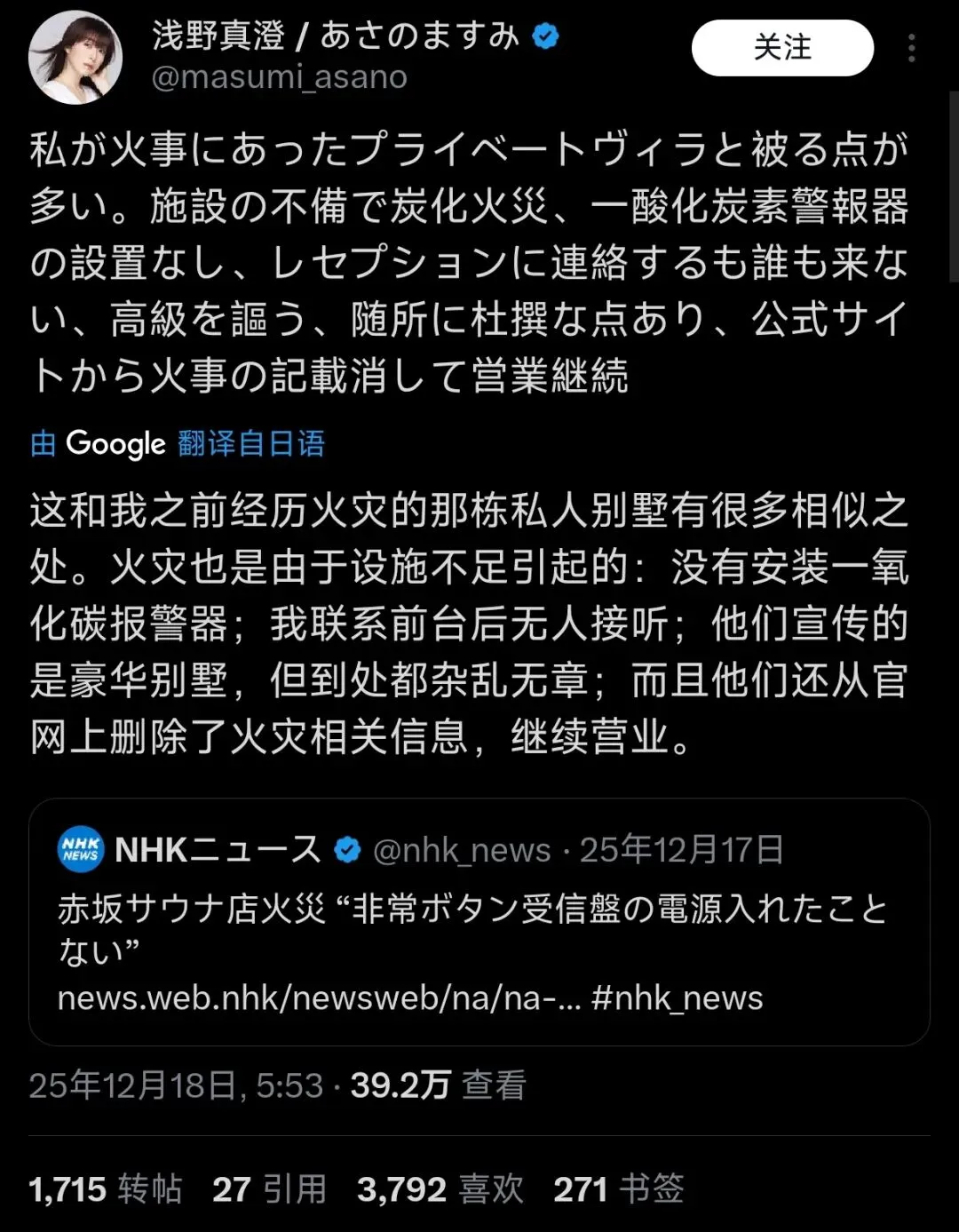 姬翻了翻浅野真澄的X账号,发现她其实还有不断po出后续感想以及后续情况,并且其实早在11月(甚至更早)就在不停地说这件事情了,甚至在桑拿事件发生时,她也在提自己遭遇的事件,希望引起大家的注意。
