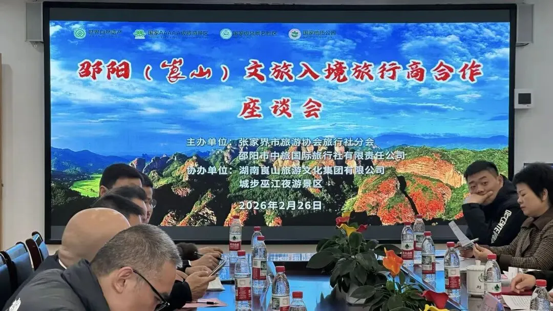 2月26日下午,邵阳文旅入境游旅行商座谈会在张家界旅游协会旅行社分会顺利举行。来自邵阳新宁崀山景区、城步巫江夜游景区及邵阳中旅等文旅企业代表,与张家界旅游协会旅行社分会核心成员、入境游旅行社代表共四十余人齐聚一堂,以“资源联动、客源互送、合作共赢”为核心,共商两地入境旅游合作新路径,为湖南世界遗产文旅融合发展注入新动能。