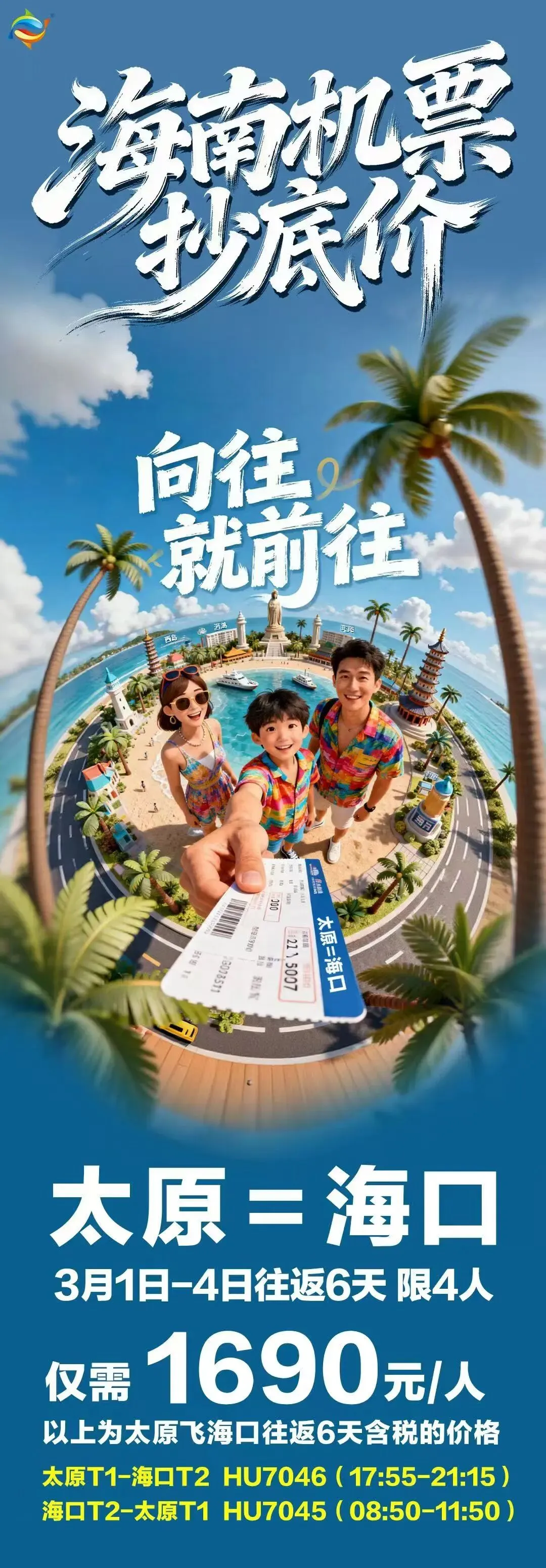 太原飞海南机票团票三月初的抄底价现在降到低点,相比春节期间价格,已经便宜了很多,趁着这个时间,趁着旅游群体没有二月那么密集的时候,真的可以挑选一个合适的时间出门放风了。