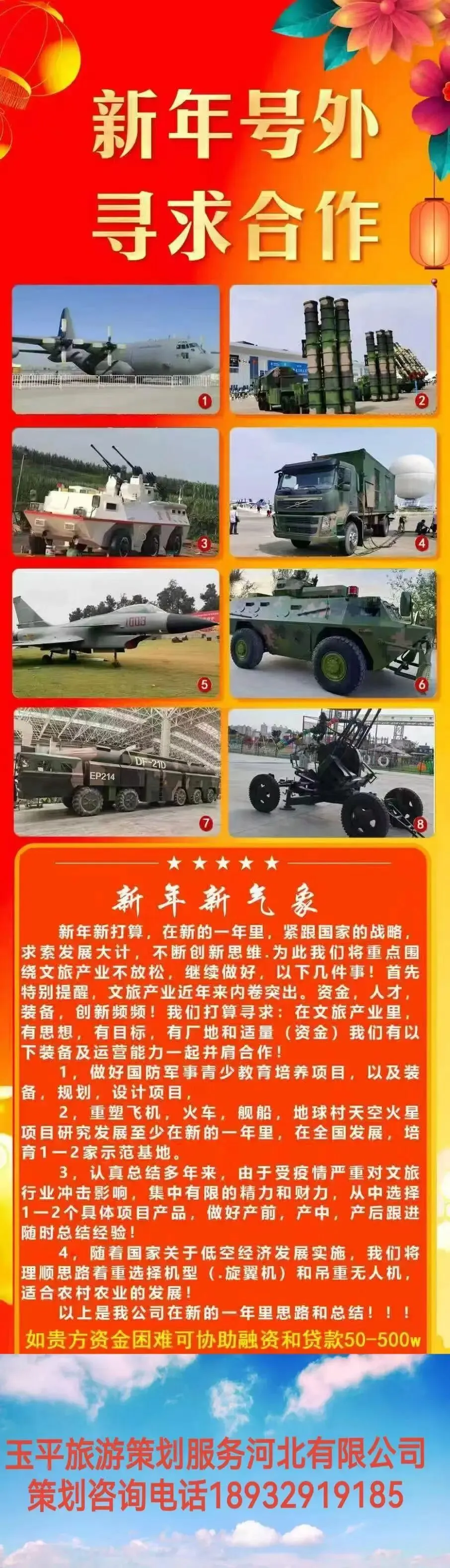 我们专注与A级成熟景区合作,共建红色国防教育基地,提供建设融资、规划设计、运营指导、品牌推广、客流导入全链条服务,并配备退役/仿真军机、战车、坦克、舰船、导弹等实景装备。