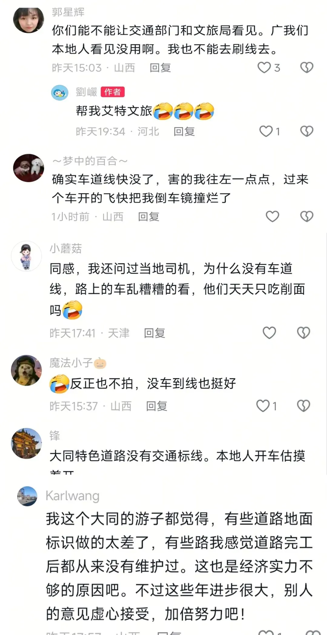 不少游客在社交平台吐槽,大同景点值得一去,可路面标线实在堪忧,开车全程紧张,非常影响游玩心情。
