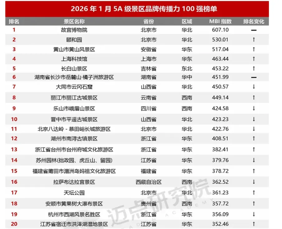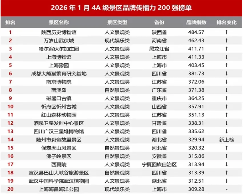 (作者系文商旅产业经济学家,本文基于2026年1月景区品牌传播力榜单(迈点研究院)分析,仅代表个人观察。)