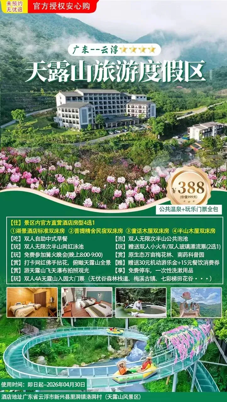 388元抢【云浮·4A天露山景区】湖景/菩提精舍/木屋房型4选1+自助早餐+无限次公共温泉+半山网红泳池+小火车/漂流+梅溪古镇